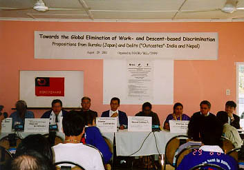 ダリット(被差別カースト)、日本の部落差別など「職業と世系(門地)にもとづく差別に反対する人々によるデモ。(NGOフォーラム) |