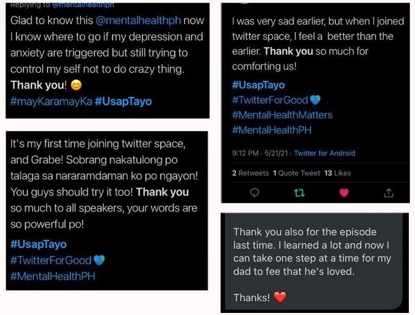 Yet the significance of #UsapTayo cannot be measured solely in digital metrics. Participants consistently expressed feeling heard, validated and less alone. In a context where formal services remain limited, such structured digital conversations serve as crucial psychosocial entry points.