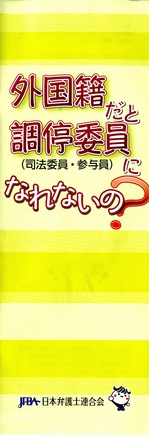 パンフレットの内容はこちら→pdf 近畿弁護士会連合会が主催して、2月25日、大阪弁護士会館で、弁護士会会員を中心に市民活動家などが参加したシンポジウム「外国籍だと調停委員(司法委員・参与員)になれないのー多文化社会における調停委員の職務の実態と公権力の行使ー」が開催された。11年間の弁護士会の取り組み、日本が加入している条約監視機関からの勧告についての基調報告、採用を拒否された弁護士や調停委員でもある弁護士などによる問題提起があった。また、わかりやすくこの問題を解説したパンフレット「外国籍だと調停委員(司法委員・参与委員)になれないの?」を最近、日本弁護士連合会が作成し、参加者に配布された。 調停委員とは、市民から裁判所に選任され、民事や家族に関する紛争において、当事者の話を聞いて合意形成をはかる役割で,非常勤公務員とされている。 |