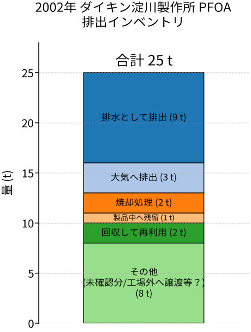 ダイキン工業が一体どれだけの量のPFASを環境中に排出してきたかは十分には明らかになっていませんが、2002年分については当時の内部告発資料が存在します(中川七海『終わらないPFOA汚染』43頁以下参照)。