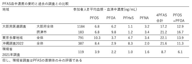 さらに「大阪PFAS汚染と健康を考える会」と京都大学の研究グループによる2023年検査によれば、PFOAの血中濃度は、大阪府全体で環境省調査の約3倍弱、摂津市住民は4倍強であり、過去からの水、大気、食品経由の暴露が疑われています。